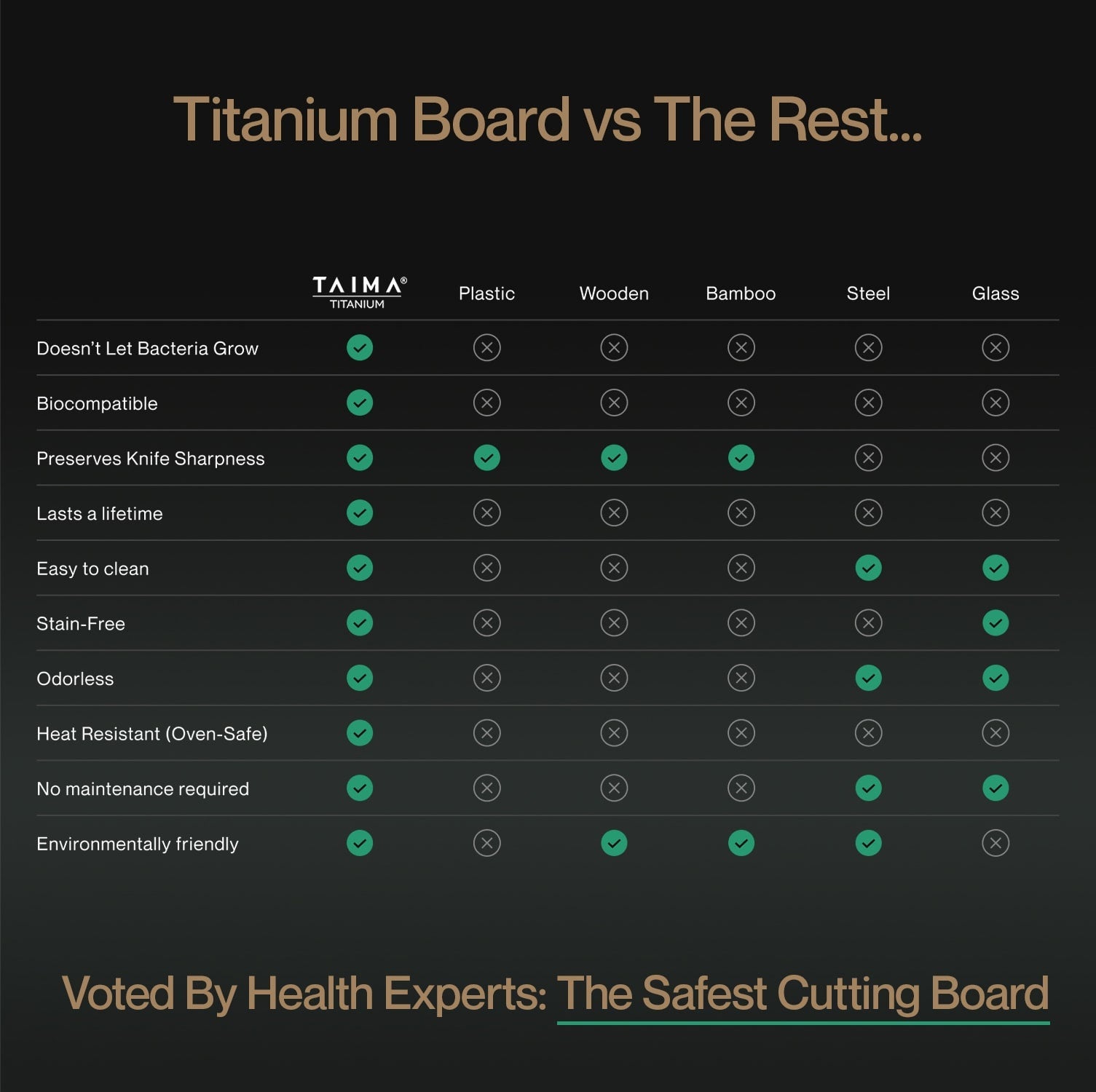 La planche Taima® est fabriquée en titane de qualité médicale et antibactérien — naturellement auto-stérilisante et 100 % sans toxines. Alors que les planches en plastique libèrent des microplastiques et que celles en bois absorbent les bactéries, le titane reste complètement stérile, garantissant qu’aucune contamination n’atteint vos aliments.